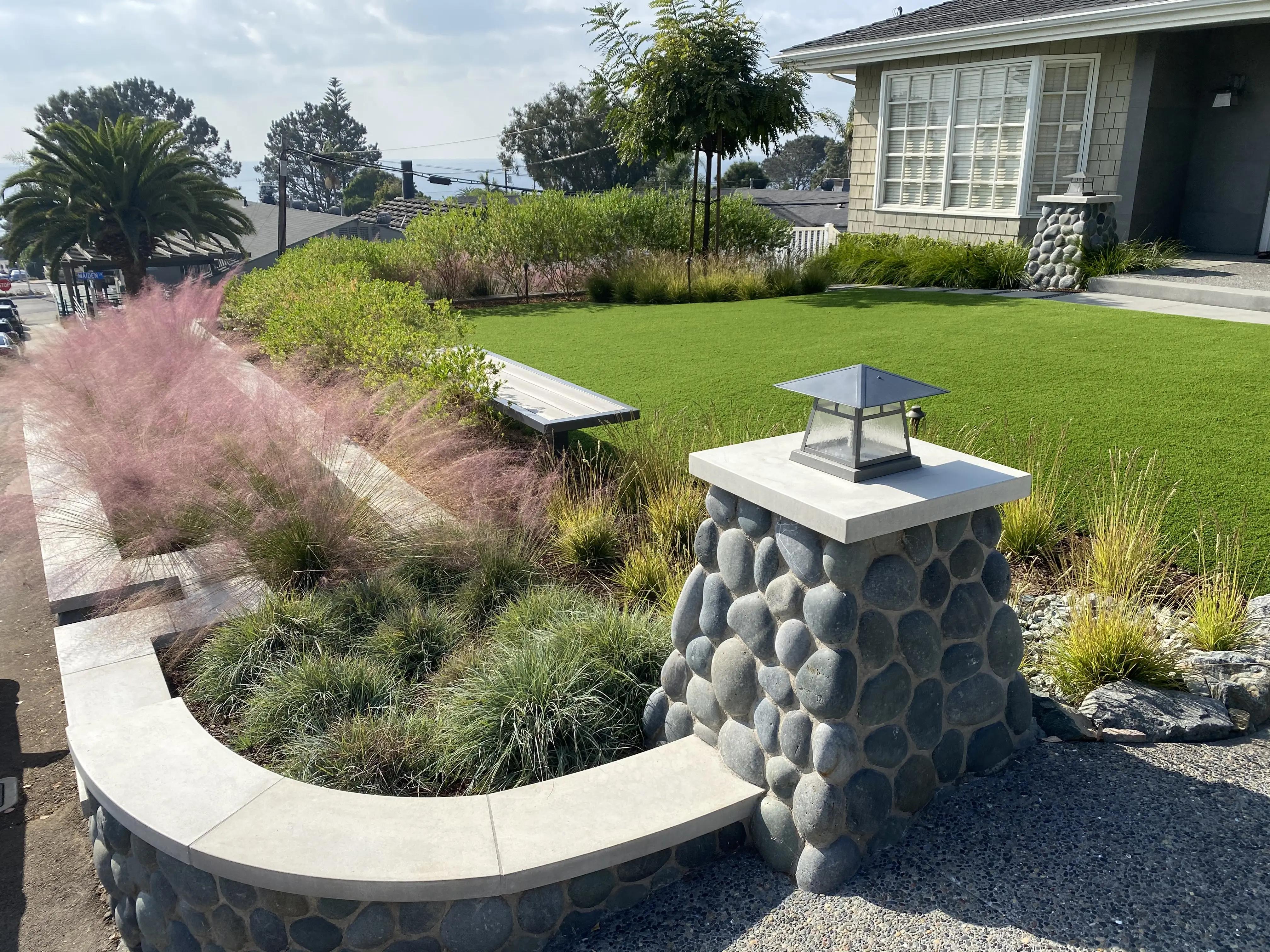 Our team implemented a comprehensive hardscape design that provides both structure and flow, creating distinct zones for relaxation and entertaining. The landscape design utilizes coastal-friendly plantings that thrive in the salt air while adding softness and vibrant texture to the property. By prioritizing high-quality materials and an open, airy layout, we transformed the yard into an authentic extension of the home—perfectly suited for the quintessential Southern California lifestyle.